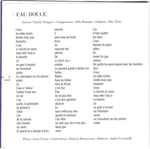 Composed By Aldo Romano | Double Bass Rosario Bonaccorso | Drums André Ceccarelli | Piano Yvan Cassar | Vocals, Lyrics By Claude Nougaro