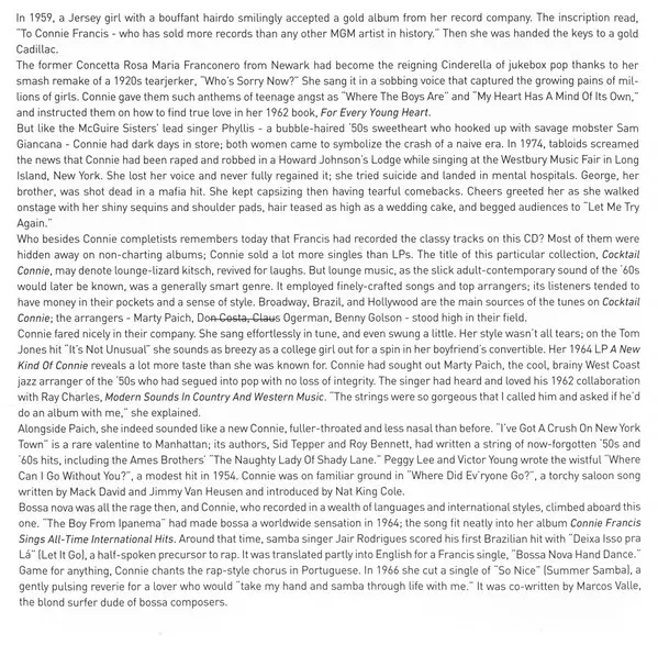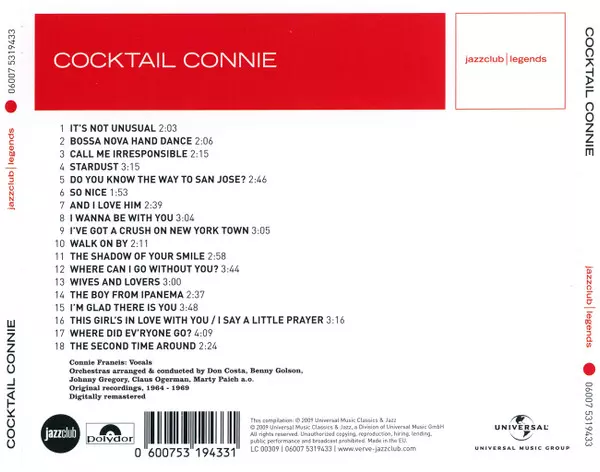 Connie Francis: Cocktail Connie La version sur CD en Remasterisé édition. Cette édition particulière a été publiée en L'Europe dans la maison d'édition Polydor Le 2 décembre 2022. Album couvre tous les genres Pop, Jazz, Musique latine et Musique facile à écouter. Jazz Club.
