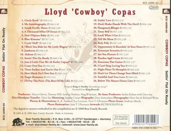 Cowboy Copas: Settin' Flat On Ready La version sur CD en Norme édition. Cette édition particulière a été publiée en Allemagne dans la maison d'édition Bear Family Records Le 20 mars 2008. Album couvre tous les genres Rock, Folk, World, & Country, Country, Rockabilly et Honky Tonk.