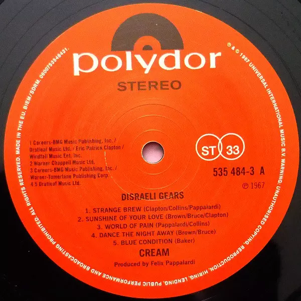 Cream Disraeli Gears' second album, released in 1967, was a critical and commercial success. The album was produced by Felix Pappalardi and recorded at Atlantic Recording Studios in New York City. It was the first album to feature Jack Bruce on bass, guitar and vocals, Eric Clapton on guitar and vocals and Ginger Baker on drums. The album's titl...