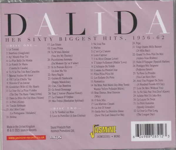 Dalida: Her Sixty Biggest Hits , 1956-1962 La version sur 2CD en Norme édition. Cette édition particulière a été publiée en ROYAUME-UNI dans la maison d'édition Jasmine Records Le 25 avril 2025. Album couvre tous les genres Pop et Chanson.