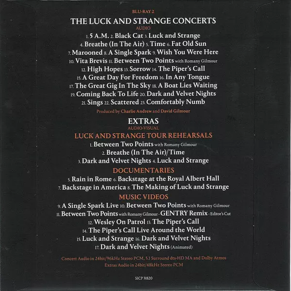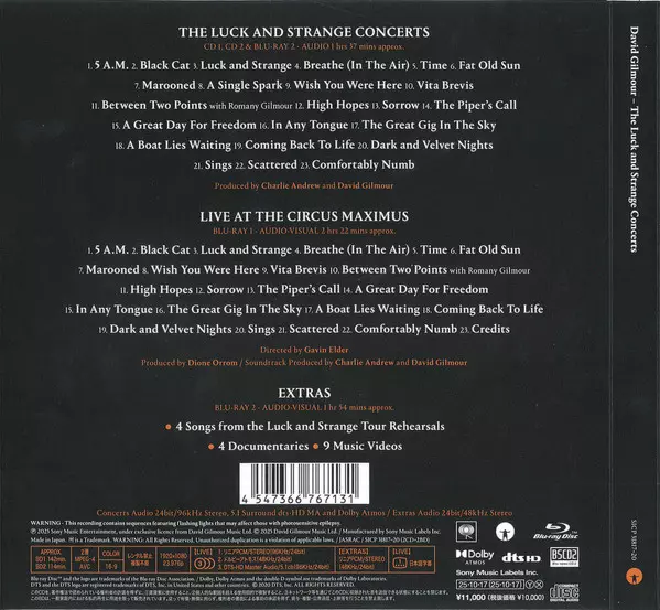 David Gilmour: The Luck And Strange Concerts La version sur 2CD/2Blu-ray en Norme édition. Cette édition particulière a été publiée en Japon dans la maison d'édition Sony Records Int'l Le 10 janvier 2025. Album peut être classé dans un genre Rock. Blu Spec CD2.