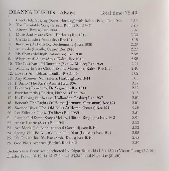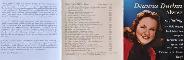 Deanna Durbin: Always La version sur CD en Remasterisé édition. Cette édition particulière a été publiée en Allemagne dans la maison d'édition Forum (12). Album couvre tous les genres Pop, Musique classique, Scène et écran et Modernism.