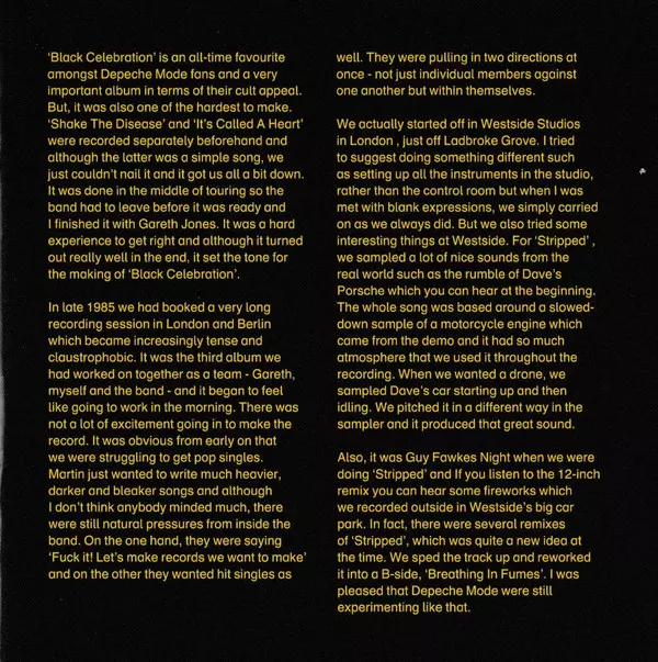Black Celebration is Depeche Mode's fifth studio album and is considered one of the band's darkest and most atmospheric works. All eleven songs were written by Martin Gore, with four songs - A Question of Lust, Sometimes, It Doesn't Matter and World Full of Nothing - sung by himself. The album title "Black Celebration" was a false lead for Depec...