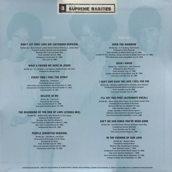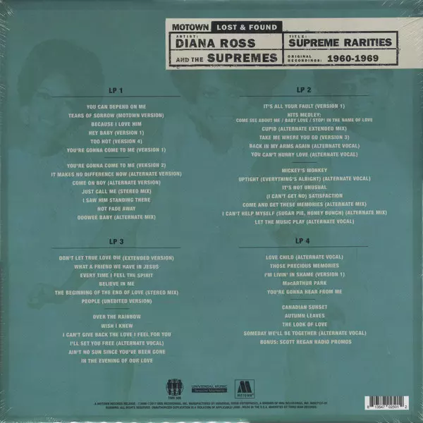 Diana Ross: Supreme Rarities: Motown Lost & Found (1960-1969) La version sur Le vinyle 4LP/Coffret en Norme édition. Cette édition particulière a été publiée en ÉTATS-UNIS dans la maison d'édition Third Man Records En collaboration avec Universal Music Special Markets et Motown Le 6 avril 2018. Album peut être classé dans un genre Funk / Soul.