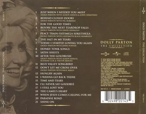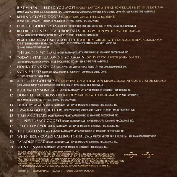| 1 | Dolly Parton, Alison Krauss, John Sebastian: Just When I Needed You Most | 4:38 min | |