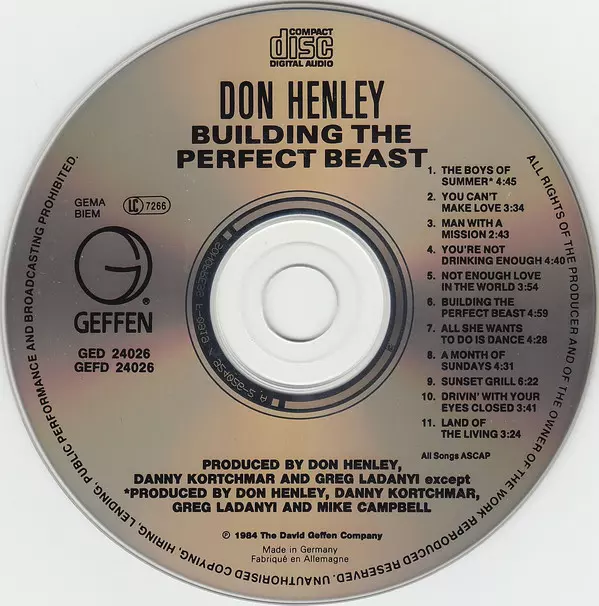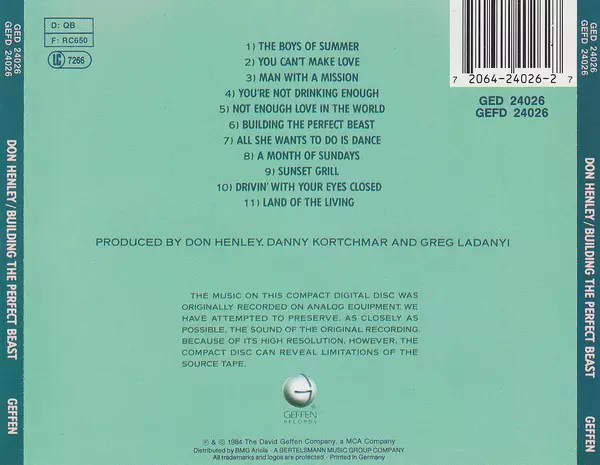 Don Henley: Building The Perfect Beast La version sur CD en Norme édition. Cette édition particulière a été publiée en L'Europe dans la maison d'édition Geffen Records Le 1 mars 1993. Album couvre tous les genres Rock et Pop Rock.