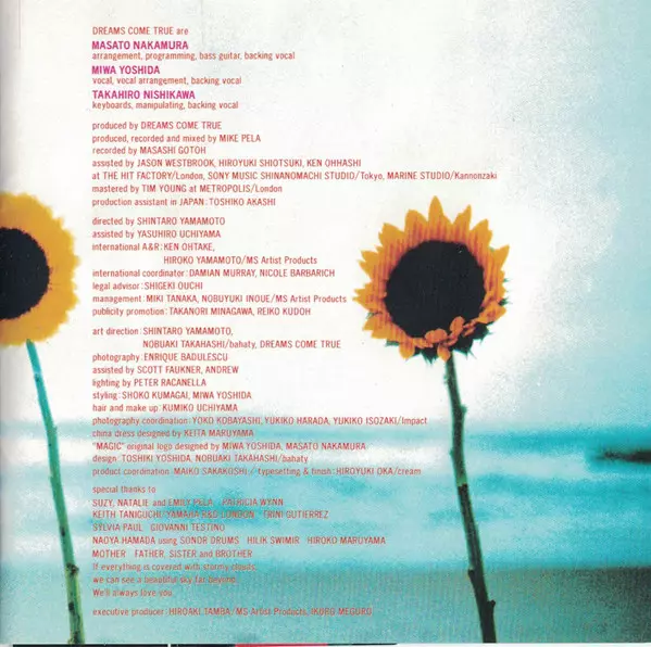 Arranged By Masato Nakamura (2) | Arranged By [Backing Vocal Arrangement] Masato Nakamura (2), Miwa Yoshida | Backing Vocals Dreams Come True, Glen Scott, Jerome Brown, Sharon Beswick | Drums, Cymbal [Cymbals] Naoya Hamada | Harp Skaila Kanga | Lyrics By Miwa Yoshida | Music By Masato Nakamura (2) | Piano Kow Otani | Programmed By [Strings, Synthesizers, Drums, Percussion], Bass Guitar Masato Nakamura (2) | Saxophone Nick Pentelow | Trombone Peter Thoms | Trumpet Martin Drover, Raul D'Oliveira