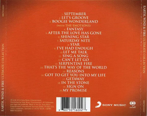Earth, Wind & Fire: Ultimate Collection La version sur CD en Norme édition. Cette édition particulière a été publiée en L'Europe dans la maison d'édition Columbia En collaboration avec Sony Music Le 13 juin 2016. Album couvre tous les genres Musique électronique, Funk / Soul, Soul, Funk et Disco.
