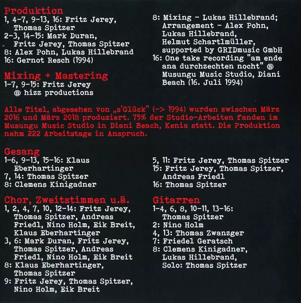 Backing Vocals Andreas Friedl (2), Eik Breit, Fritz Jerey, Klaus Eberhartinger, Nino Holm, Thomas Spitzer | Bass Alvis Reid | Drums Andreas Friedl (2) | Guitar Friedel Geratsch | Keyboards, Drum Programming Fritz Jerey | Mouth Organ Christian Almer | Vocals Thomas Spitzer