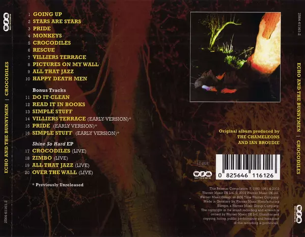 Echo & The Bunnymen: Crocodiles La version sur CD en Remasterisé édition. Cette édition particulière a été publiée en L'Europe dans la maison d'édition Warner Strategic Marketing Le 27 janvier 2004. Album couvre tous les genres Rock, Pop, New Wave, Post-Punk et Alternative rock.