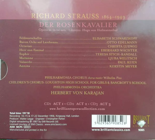 | Artiste | Herbert von Karajan | Philharmonia Orchestra | Richard Strauss | Christa Ludwig | Elisabeth Schwarzkopf | Eberhard Wächter | Otto Edelmann | Teresa Stich-Randall |
