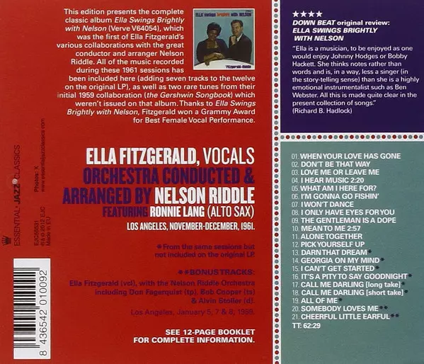 ELLA SWINGS BRIGHTLY WITH NELSON plus nine bonus tracks! Ella Swings Brightly with Nelson presents several recordings that Ella Fitzgerald made with conductor and arranger Nelson Riddle. This CD features all of the recordings from those sessions in 1961 (plus seven tracks that were not on the album at the time), plus two rarities from her first ...