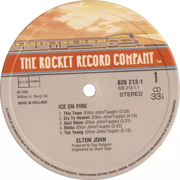 Elton John: Ice On Fire La version sur Le vinyle LP en Norme édition. Cette édition particulière a été publiée en L'Europe dans la maison d'édition The Rocket Record Company année 1985. Album couvre tous les genres Rock, Pop, Pop Rock et Soft Rock.