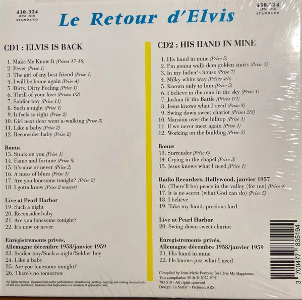 Elvis Presley: Le Retour D' Elvis (Is Back & His Hand In Mine) La version sur 2CD en Norme édition. Cette édition particulière a été publiée en France dans la maison d'édition VPI (3) Le 2 septembre 2022. Album couvre tous les genres Rock, Pop, Ballade et Rock & Roll.
