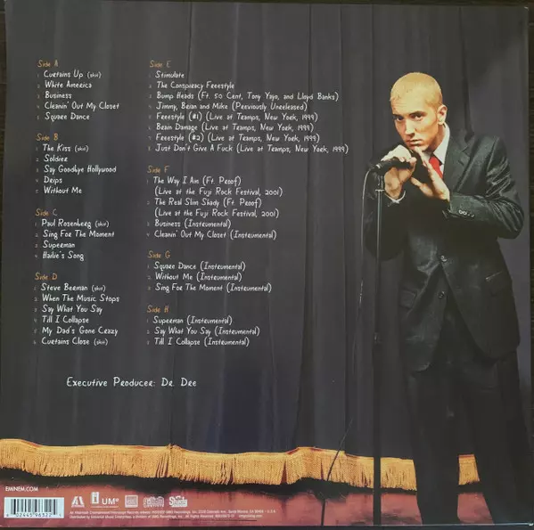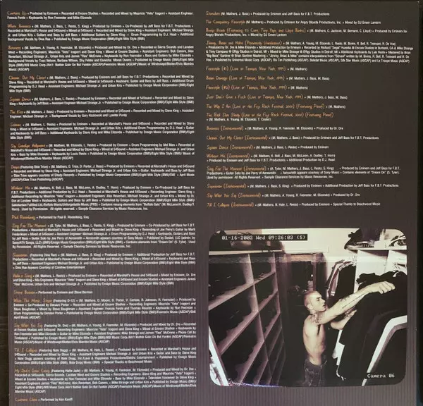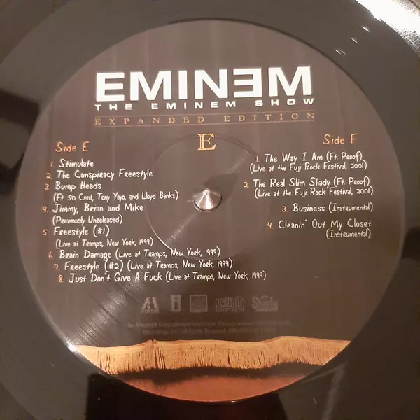 Eminem: The Eminem Show DLX La version sur Le vinyle 4LP en deluxe édition. Cette édition particulière a été publiée en Dans le monde entier dans la maison d'édition Aftermath Entertainment En collaboration avec Interscope Records, UMe, Web Entertainment et Shady Records Le 27 janvier 2023.