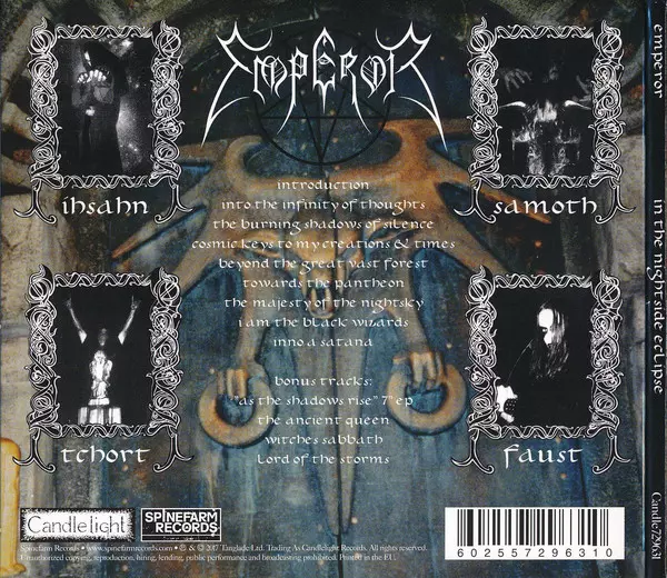 Emperor "In The Nightside Eclipse" is a groundbreaking black metal album released in 1994. The album is considered a classic of the black metal genre and is cited as an influence by many bands in the black metal and death metal scene. In The Nightside Eclipse is a dark and atmospheric album with snappy guitar riffs and gritty vocals. The album's...