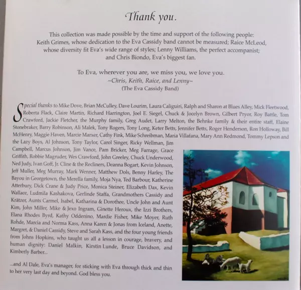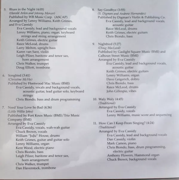 Double Bass [Upright Bass] Larry Melton | Drum Programming Chris Biondo | Electric Organ [Hammond Organ] John Gillespie | Lead Vocals, Backing Vocals [Background Vocals] Eva Cassidy | Piano, Backing Vocals [Background Vocals] Mark Carson | Violin Mike Stein | Written-By Diane Scanlon, Greg Smith (14)