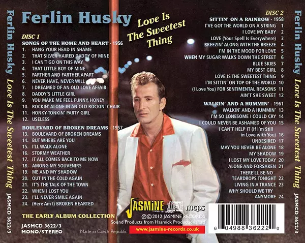 Ferlin Husky: Love Is The Sweetest Thing - The Early Album Collection La version sur 2CD en Norme édition. Cette édition particulière a été publiée en ROYAUME-UNI dans la maison d'édition Jasmine Records Le 7 août 2012. Album couvre tous les genres Pop, Scène et écran, Folk, World, & Country, Country et Honky Tonk.