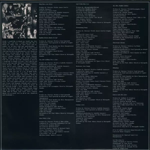 Cello Ian Burdge | Drums, Percussion Christopher Lloyd Hayden | Harp Tom Moth | Mixed By Cenzo Townshend | Mixed By [Assistant] Neil Comber | Producer, Drums, Percussion, Piano James Ford | Recorded By Jimmy Robertson | Strings [Arrangement], Violin Sally Herbert | Viola Bruce White | Violin Everton Nelson | Written-By, Drums, Percussion Florence Welch | Written-By, Producer [Additional], Drums, Percussion, Piano Isabella Summers