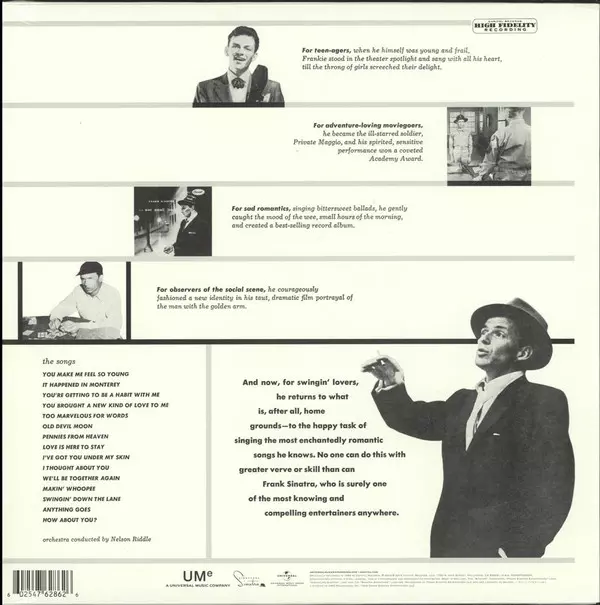 Frank Sinatra "Songs for Swingin' Lovers!" was released in 1956 and is one of his most popular albums. The album features classic swing and big band arrangements of popular standards such as "I've Got You Under My Skin", "The Lady Is a Tramp" and "That Old Black Magic". The album was recorded with a large orchestra and Sinatra's signature vocal ...