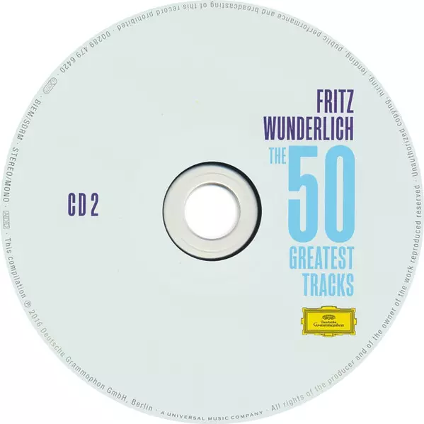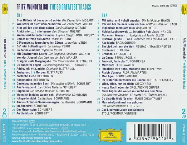 Fritz Wunderlich: The 50 Greatest Tracks La version sur 2CD en Norme édition. Cette édition particulière a été publiée en Allemagne dans la maison d'édition Deutsche Grammophon Le 30 septembre 2016. Album couvre tous les genres Pop, Musique classique, Romance, Opéra et Operetta.
