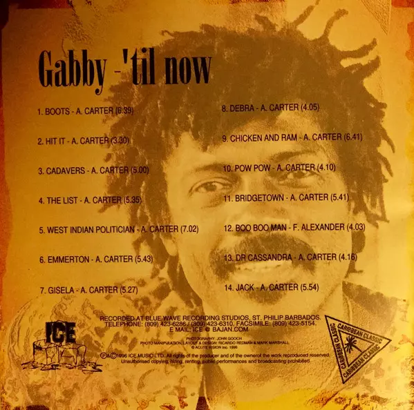Anthony "Gabby" Carter: 'Til Now La version sur CD en Norme édition. Cette édition particulière a été publiée en La Barbade dans la maison d'édition ICE Le 14 juillet 2017. Album couvre tous les genres Folk, World, & Country, Reggae, Calypso et Soca.