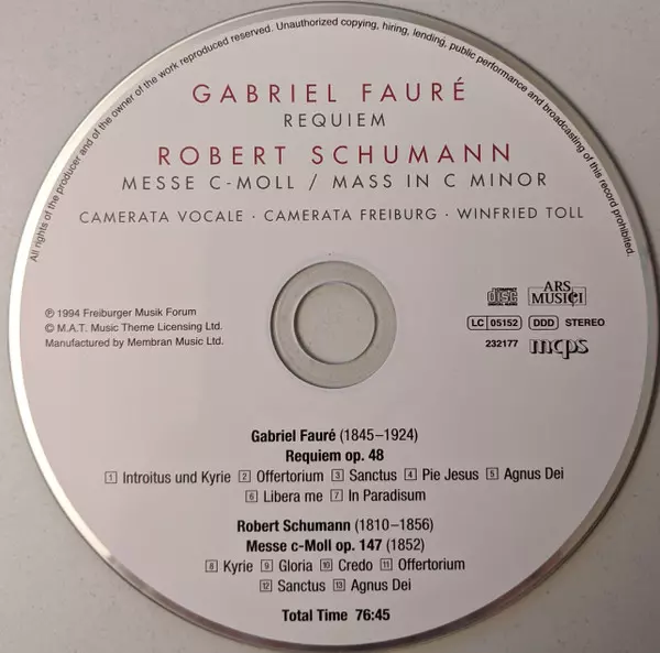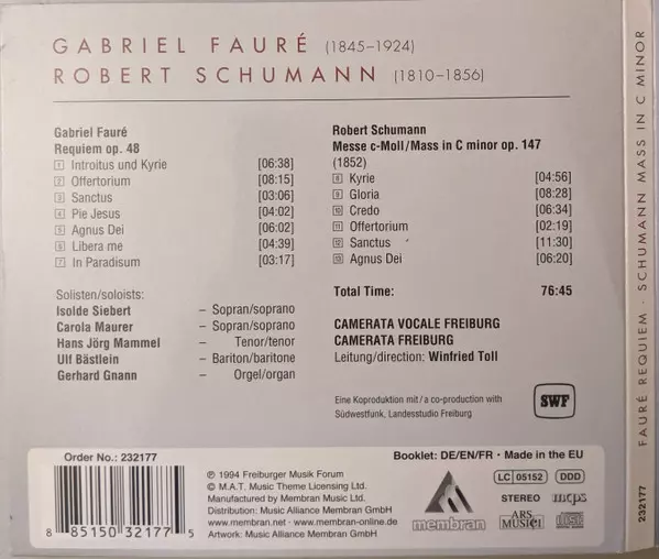 | Artiste | Robert Schumann | Gabriel Fauré | Camerata Vocale Freiburg | Winfried Toll | Camerata Freiburg |