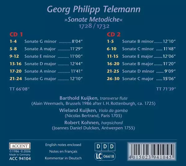 | Artiste | Georg Philipp Telemann | Barthold Kuijken | Wieland Kuijken | Robert Kohnen |