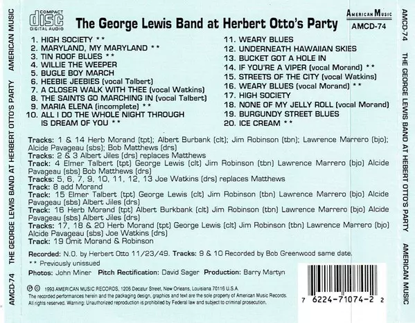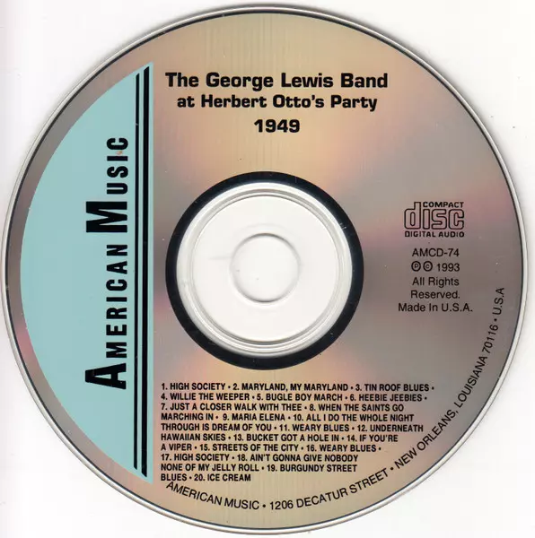 George Lewis: At Herbert Otto's Party La version sur CD en Norme édition. Cette édition particulière a été publiée en ÉTATS-UNIS dans la maison d'édition American Music Le 6 mars 2014. Album peut être classé dans un genre Jazz.