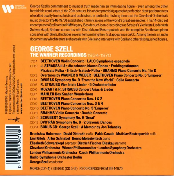 George Szell: The Warner Recordings, 1934-1970 La version sur 14CD/Coffret en Remasterisé édition. Cette édition particulière a été publiée en L'Europe dans la maison d'édition Warner Classics Le 20 novembre 2020. Album couvre tous les genres Musique classique, Non-Music, Modernism, Romance, Neo-Romantic et Interview.
