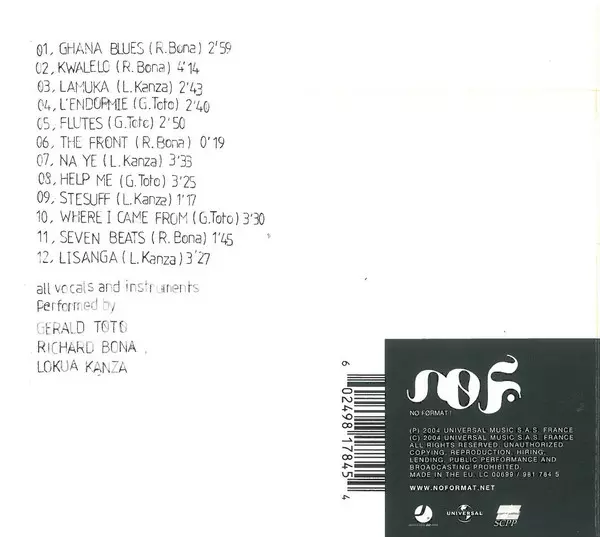 | Artiste | Gerald Toto | Richard Bona | Lokua Kanza |