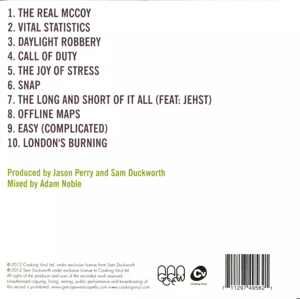 Acoustic Guitar, Drum Machine [C R 78], Mellotron, Synthesizer [Moog, Odyssey] Sam Duckworth | Backing Vocals [BV's] Charlie Kennedy (2), Danny O'Neill (2), Jason Perry | Body Percussion [Hand Percussion] Andy Theakstone | Engineer [Engineering] Danny O'Neill (2) | Keyboards [Kurzweil], Mellotron, Synthesizer [Moog], Piano Danny O'Neill (2)