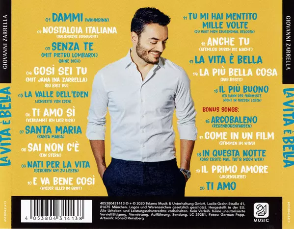 Giovanni Zarrella: La Vita È Bella (Gold Edition) La version sur CD en Norme édition. Cette édition particulière a été publiée en Allemagne dans la maison d'édition 21 Music (2) Le 10 janvier 2020. Album couvre tous les genres Pop et Schlager. Gold Edition.