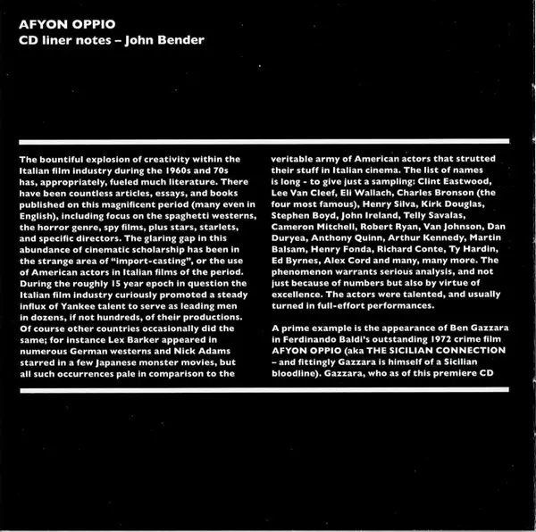 | Titre | Afyon Oppio = The Sicilian Connection (Original Motion Picture Soundtrack) |