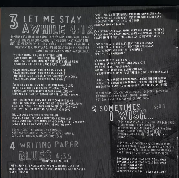 Accordion, Mandolin T-Bone Wolk | Double Bass [Upright] Mark Murphy (4) | Drums Gary Burke | Guitar, Harmonica, Vocals Guy Davis (3) | Words By, Music By Guy Davis (3)