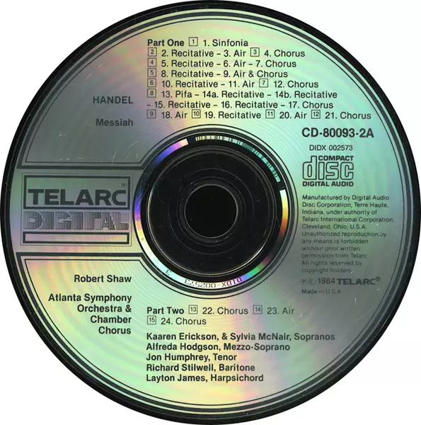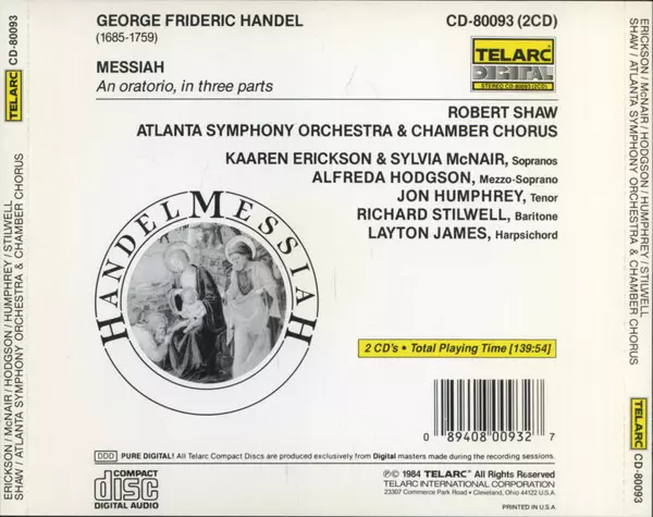 Atlanta Symphony Orchestra: Messiah La version sur 2CD en Norme édition. Cette édition particulière a été publiée en ÉTATS-UNIS dans la maison d'édition Telarc Digital Le 25 mai 2009. Album couvre tous les genres Musique classique, Musique baroque et Oratorio.