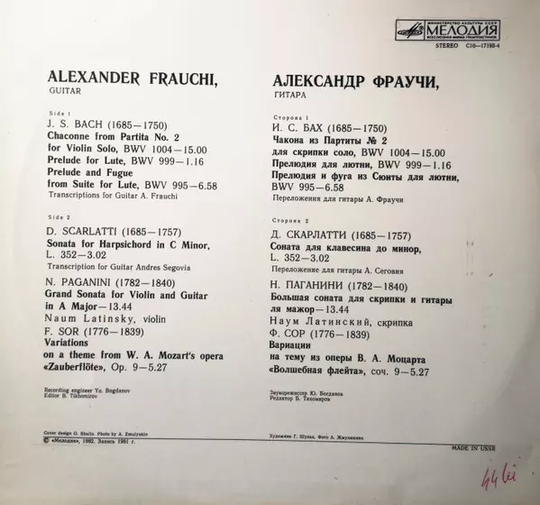 Artiste | Johann Sebastian Bach | Domenico Scarlatti | Fernando Sor | Niccolò Paganini | Aleksander Frauchi |