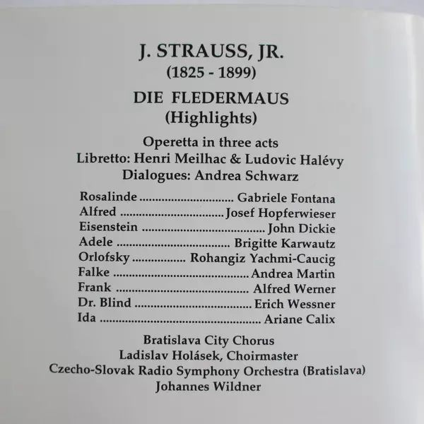 | Artiste | Slovak Radio Symphony Orchestra | Johann Strauss Jr. | Andrea Martin | Johannes Wildner | John Dickie | Rohangiz Yachmi | Bratislava City Choir | Gabriele Fontana | Josef Hopferwieser | Brigitta Karwautz | Alfred Werner |