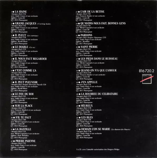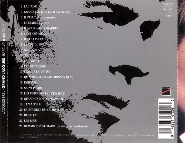 Jacques Brel: Grand Jacques La version sur CD en Norme édition. Cette édition particulière a été publiée en France dans la maison d'édition Barclay Le 30 janvier 1989. Album couvre tous les genres Pop et Chanson.