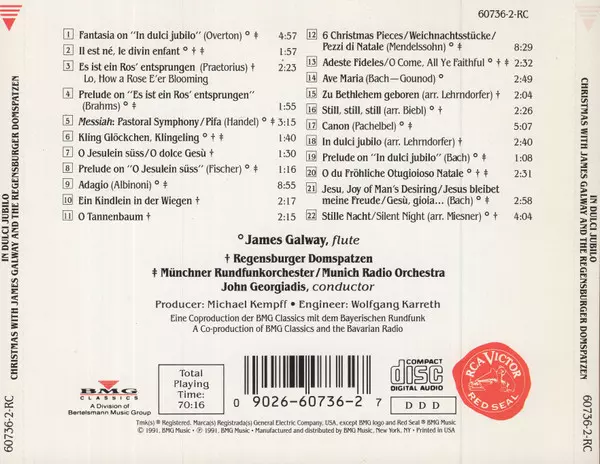 James Galway: In Dulci Jubilo Christmas With James Galway And The Regensburger Domspatzen La version sur CD en Norme édition. Cette édition particulière a été publiée en ÉTATS-UNIS dans la maison d'édition RCA Victor Red Seal Le 2 août 2007. Album couvre tous les genres Musique classique, Folk, World, & Country, Musique baroque, Modernism et Holiday.