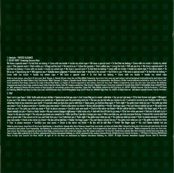 Drum Programming Alex Richbourg | Engineer [Assistant], Mixed By [Assistant] Xavier Smith | Engineer, Mixed By Steve Hodge | Guitar Mike Scott (7) | Instruments [All Other Musical Instruments] Jimmy Jam & Terry Lewis | Keyboards James "Big Jim" Wright | Recorded By [Vocals, Assistant] Tim Lauber | Recorded By [Vocals] Steve Hodge | Vocals [All] Janet Jackson | Written-By James Harris III, Janet Jackson, René Elizondo Jr., Terry Lewis