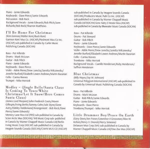 Arranged By [Arrangement] Bob Rock, Dave Pierce, Jamie Edwards | Backing Vocals [Background Vocals] Camille Henderson, Ruby Henderson, Saffron Henderson | Bass Pat Kilbride (2) | Cello Carina Reeves | Drums Pat Steward | Guitar Rob Piltch | Keyboards Dave Pierce, Jamie Edwards | Piano Jamie Edwards | Trombone Mike Herriott | Violin Adele Pierre, Drew Jurecka, Elizabeth Lowen-Andrews, Janetta Wilczewska, Jennifer Burford, Martin Bazarian | Written-By Gene Autry, Haven Gillespie, Irving Berlin, J. Fred Coots, James Lord Pierpont, Jule Styne And Sammy Cahn, Oakley Haldeman