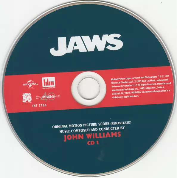 John Williams: Jaws (50th Anniversary Edition) La version sur 3CD en Remasterisé édition. Cette édition particulière a été publiée en ÉTATS-UNIS dans la maison d'édition Intrada Le 3 octobre 2025. Album couvre tous les genres Soundtrack, Film Score, Cinematic Classical, Orchestral et Halloween Music. Special Anniversary Collector's Edition 3CD.