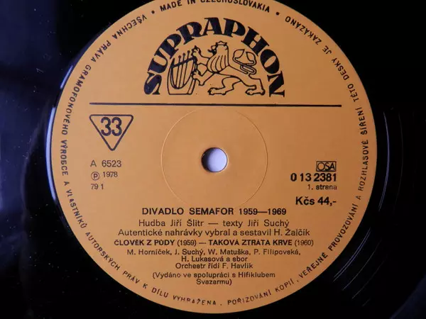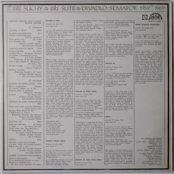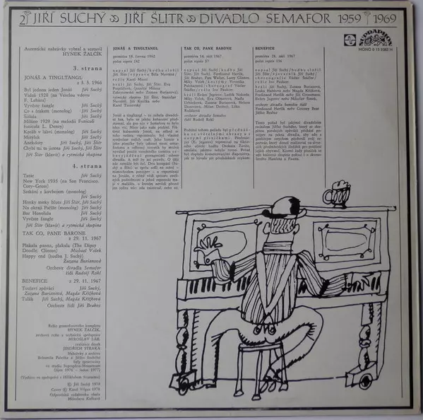 Jiří Suchý & Jiří Šlitr: Divadlo Semafor 1959 - 1969 (1-3) La version sur Le vinyle 3LP en Norme édition. Cette édition particulière a été publiée en Tchécoslovaquie dans la maison d'édition Supraphon année 1979. Album couvre tous les genres Pop, Non-Music, Parole, Chanson et Classiques tchécoslovaques.