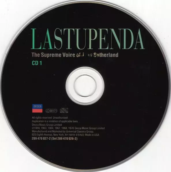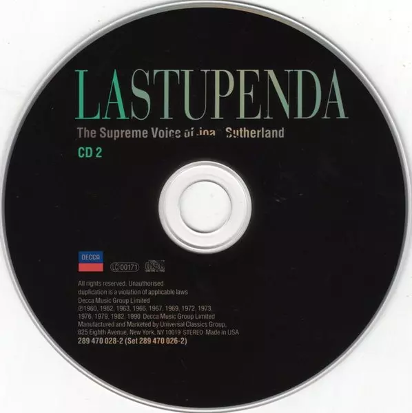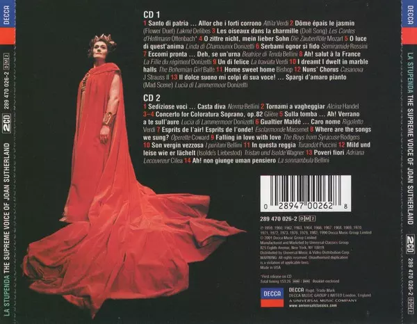 Joan Sutherland: La Stupenda (The Supreme Voice Of Joan Sutherland) La version sur 2CD en Norme édition. Cette édition particulière a été publiée en ÉTATS-UNIS dans la maison d'édition Decca Le 9 octobre 2001. Album couvre tous les genres Musique classique, Scène et écran, Musical, Musique baroque, Romance et Opéra.