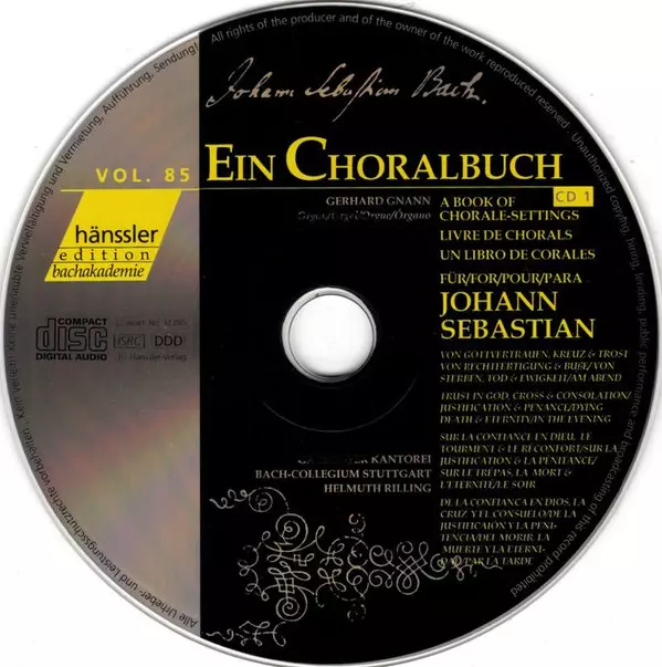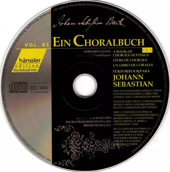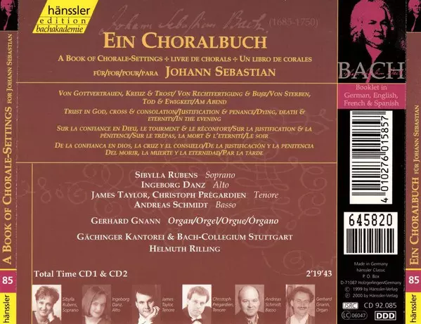 Johann Sebastian Bach: A Book Of Chorale-Setting For Johann Sebastian: Trust In God, Cross And Consolation - Justification And Penance - Dying, Death And Eternity - In The Evening La version sur 2CD en Norme édition. Cette édition particulière a été publiée en Allemagne dans la maison d'édition Hänssler Classic Le 25 juillet 2000. Album couvre tous les genres Musique classique, Musique baroque et Christmas.