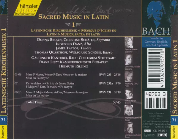 | Titre | Sacred Music In Latin - 1: Missa BWV 233; Kyrie Eleison BWV 233A; Missa BWV 234 |