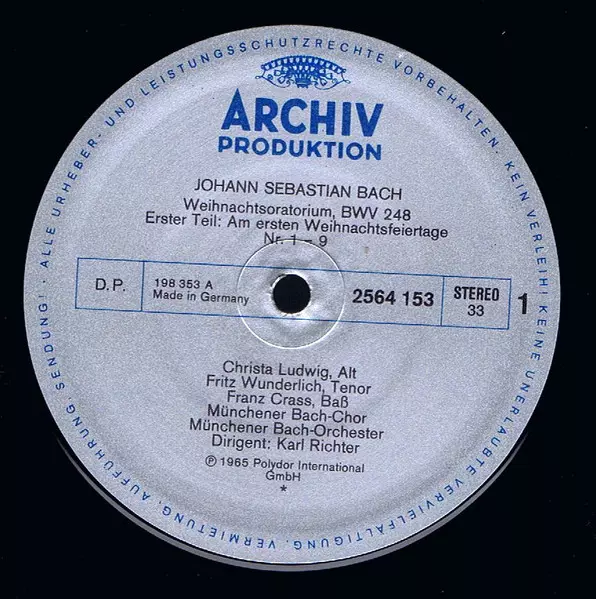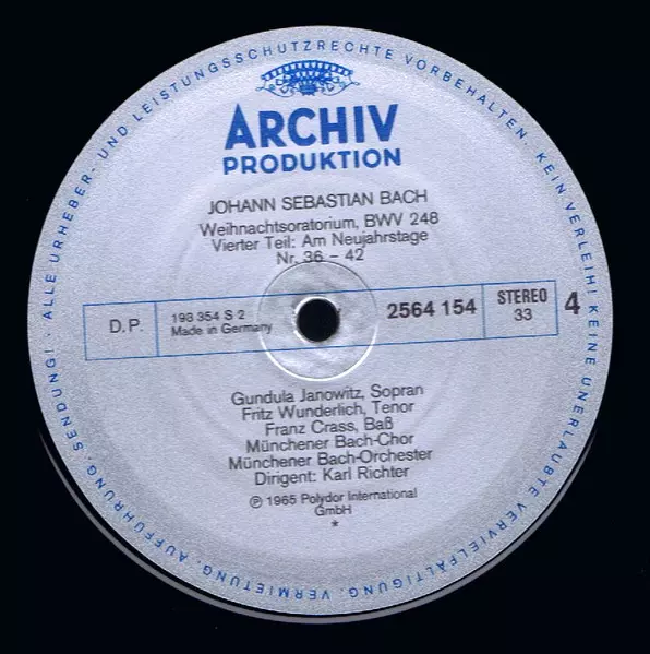 | Artiste | Johann Sebastian Bach | Gundula Janowitz | Christa Ludwig | Karl Richter | Fritz Wunderlich | Münchener Bach-Orchester | Franz Crass | Münchener Bach-Chor |