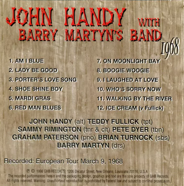 | Titre | John Handy With Barry Martyn's Band 1968 |